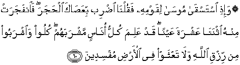 60. Dan (ingatlah) ketika Musa memohon air untuk kaumnya, lalu Kami
