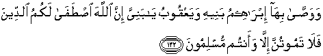 132. Dan Ibrahim telah mewasiatkan ucapan itu kepada anak-anaknya, demikian pula Ya'qub. (Ibrahim berkata): "Hai anak-anakku! Sesungguhnya Allah telah memilih agama ini bagimu, maka janganlah kamu mati kecuali dalam memeluk agama Islam".