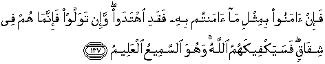 137. Maka jika mereka beriman kepada apa yang kamu telah beriman kepadanya, sungguh mereka telah mendapat petunjuk; dan jika mereka berpaling, sesungguhnya mereka berada dalam permusuhan (dengan kamu). Maka Allah akan memelihara kamu dari mereka. Dan Dia-lah Yang Maha Mendengar lagi Maha Mengetahui.