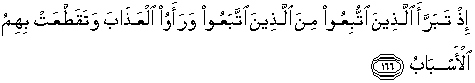 166. (Yaitu) ketika orang-orang yang diikuti itu berlepas diri dari orang-orang yang mengikutinya, dan mereka melihat siksa; dan (ketika) segala hubungan antara mereka terputus sama sekali.