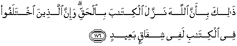 176. Yang demikian itu adalah karena Allah telah menurunkan Al Kitab dengan membawa kebenaran; dan sesungguhnya orang-orang yang berselisih tentang (kebenaran) Al Kitab itu, benar-benar dalam penyimpangan yang jauh (dari kebenaran).