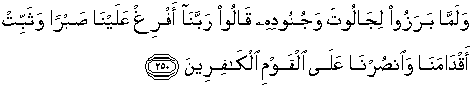 250. Tatkala Jalut dan tentaranya telah nampak oleh mereka, merekapun (Thalut dan tentaranya) berdoa: "Ya Tuhan kami, tuangkanlah kesabaran atas diri kami, dan kokohkanlah pendirian kami dan tolonglah kami terhadap orang-orang kafir."