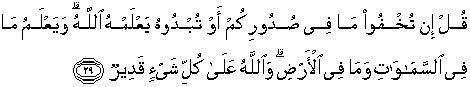 29. Katakanlah: "Jika kamu menyembunyikan apa yang ada dalam hatimu atau kamu melahirkannya, pasti Allah mengetahui." Allah mengetahui apa-apa yang ada di langit dan apa-apa yang ada di bumi. Dan Allah Maha Kuasa atas segala sesuatu.