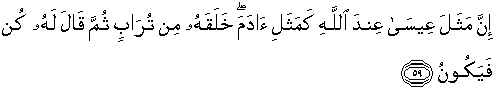 59. Sesungguhnya misal (penciptaan) Isa di sisi AllAh, adalah seperti (penciptaan) Adam. Allah menciptakan Adam dari tanah, kemudian Allah berfirman kepadanya: "Jadilah" (seorang manusia), maka jadilah dia.