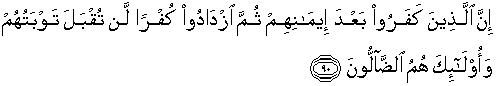 90. Sesungguhnya orang-orang kafir sesudah beriman, kemudian bertambah kekafirannya, sekali-kali tidak akan diterima taubatnya; dan mereka itulah orang-orang yang sesat.