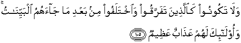 105. Dan janganlah kamu menyerupai orang-orang yang bercerai-berai dan berselisih sesudah datang keterangan yang jelas kepada mereka. Mereka itulah orang-orang yang mendapat siksa yang berat,