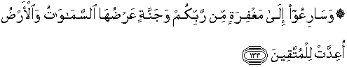 133. Dan bersegeralah kamu kepada ampunan dari Tuhanmu dan kepada surga yang luasnya seluas langit dan bumi yang disediakan untuk orang-orang yang bertakwa,