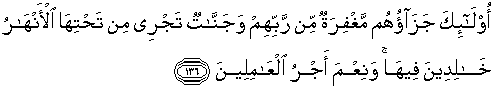 136. Mereka itu balasannya ialah ampunan dari Tuhan mereka dan surga yang di dalamnya mengalir sungai-sungai, sedang mereka kekal di dalamnya; dan itulah sebaik-baik pahala orang-orang yang beramal.