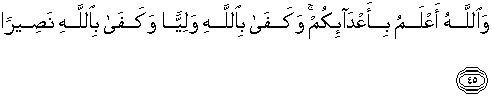 45. Dan Allah lebih mengetahui (dari pada kamu) tentang musuh-musuhmu. Dan cukuplah Allah menjadi Pelindung (bagimu). Dan cukuplah Allah menjadi Penolong (bagimu).