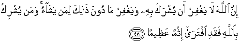 48. Sesungguhnya Allah tidak akan mengampuni dosa syirik, dan Dia mengampuni segala dosa yang selain dari (syirik) itu, bagi siapa yang dikehendaki-Nya. Barangsiapa yang mempersekutukan Allah, maka sungguh ia telah berbuat dosa yang besar.