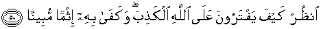 50. Perhatikanlah, betapakah mereka mengada-adakan dusta terhadap Allah? Dan cukuplah perbuatan itu menjadi dosa yang nyata (bagi mereka).