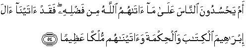 yang Allah telah berikan kepadanya? Sesungguhnya Kami telah memberikan Kitab dan Hikmah kepada keluarga Ibrahim, dan Kami telah memberikan kepadanya kerajaan yang besar.