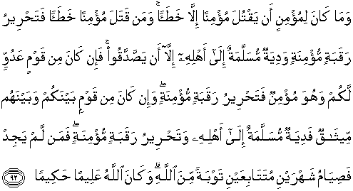 92. Dan tidak layak bagi seorang mukmin membunuh seorang mukmin