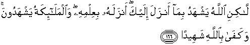 166. (Mereka tidak mau mengakui yang diturunkan kepadamu itu), tetapi Allah mengakui Al Quran yang diturunkan-Nya kepadamu. Allah menurunkannya dengan ilmu-Nya; dan malaikat-malaikat pun menjadi saksi (pula). Cukuplah Allah yang mengakuinya.