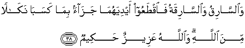 38. Laki-laki yang mencuri dan perempuan yang mencuri, potonglah tangan keduanya (sebagai) pembalasan bagi apa yang mereka kerjakan dan sebagai siksaan dari Allah. Dan Allah Maha Perkasa lagi Maha Bijaksana.