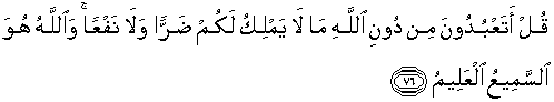 76. Katakanlah: "Mengapa kamu menyembah selain daripada Allah, sesuatu yang tidak dapat memberi mudharat kepadamu dan tidak (pula) memberi manfaat?" Dan Allah-lah Yang Maha Mendengar lagi Maha Mengetahui.