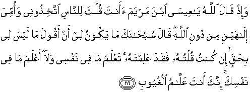 116. Dan (ingatlah) ketika Allah berfirman: "Hai Isa putera Maryam,