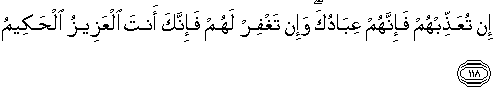 118. Jika Engkau menyiksa mereka, maka sesungguhnya mereka adalah hamba-hamba Engkau, dan jika Engkau mengampuni mereka, maka sesungguhnya Engkaulah Yang Maha Perkasa lagi Maha Bijaksana.