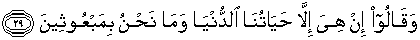 29. Dan tentu mereka akan mengatakan (pula): "Hidup hanyalah kehidupan kita di dunia ini saja, dan kita sekali-sekali tidak akan dibangkitkan"