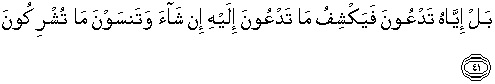 41. (Tidak), tetapi hanya Dialah yang kamu seru, maka Dia menghilangkan bahaya yang karenanya kamu berdoa kepadaNya, jika Dia menghendaki, dan kamu tinggalkan sembahan-sembahan yang kamu sekutukan (dengan Allah).