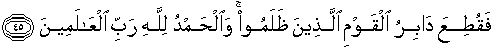 45. Maka orang-orang yang zalim itu dimusnahkan sampai ke akar-akarnya. Segala puji bagi Allah, Tuhan semesta alam.