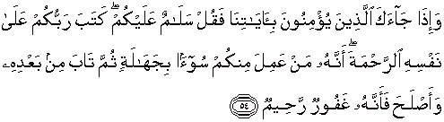 54. Apabila orang-orang yang beriman kepada ayat-ayat Kami itu datang
