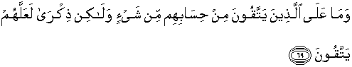 69. Dan tidak ada pertanggungjawaban sedikitpun atas orang-orang yang bertakwa terhadap dosa mereka; akan tetapi (kewajiban mereka ialah) mengingatkan agar mereka bertakwa.
