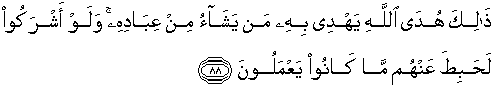 88. Itulah petunjuk Allah, yang dengannya Dia memberi petunjuk kepada siapa yang dikehendakiNya di antara hamba-hambaNya. Seandainya mereka mempersekutukan Allah, niscaya lenyaplah dari mereka amalan yang telah mereka kerjakan.