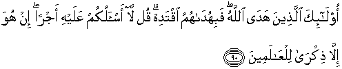 90. Mereka itulah orang-orang yang telah diberi petunjuk oleh Allah, maka ikutilah petunjuk mereka. Katakanlah: "Aku tidak meminta upah kepadamu dalam menyampaikan (Al-Quran)." Al-Quran itu tidak lain hanyalah peringatan untuk seluruh ummat.