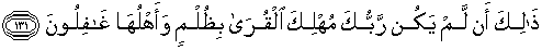 131. Yang demikian itu adalah karena Tuhanmu tidaklah membinasakan kota-kota secara aniaya, sedang penduduknya dalam keadaan lengah