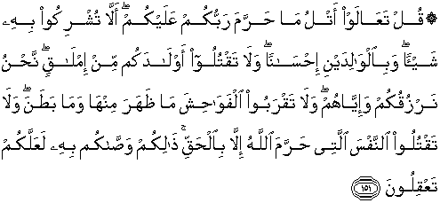 151. Katakanlah: "Marilah kubacakan apa yang diharamkan atas kamu oleh