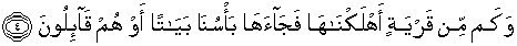 4. Betapa banyaknya negeri yang telah Kami binasakan, maka datanglah siksaan Kami (menimpa penduduk)nya di waktu mereka berada di malam hari, atau di waktu mereka beristirahat di tengah hari.