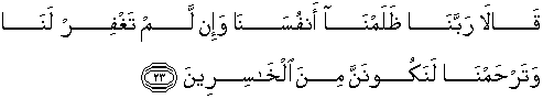 23. Keduanya berkata: "Ya Tuhan kami, kami telah menganiaya diri kami sendiri, dan jika Engkau tidak mengampuni kami dan memberi rahmat kepada kami, niscaya pastilah kami termasuk orang-orang yang merugi.