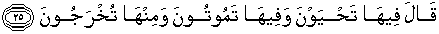 25. Allah berfirman: "Di bumi itu kamu hidup dan di bumi itu kamu mati, dan dari bumi itu (pula) kamu akan dibangkitkan.
