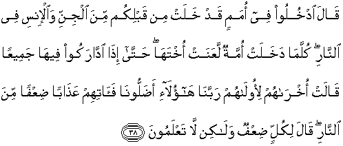 38. Allah berfirman: "Masuklah kamu sekalian ke dalam neraka bersama