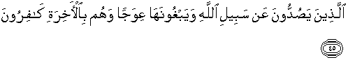 45. (yaitu) orang-orang yang menghalang-halangi (manusia) dari jalan Allah dan menginginkan agar jalan itu menjadi bengkok, dan mereka kafir kepada kehidupan akhirat."