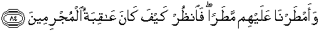 84. Dan Kami turunkan kepada mereka hujan (batu); maka perhatikanlah bagaimana kesudahan orang-orang yang berdosa itu.