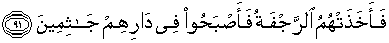 91. Kemudian mereka ditimpa gempa, maka jadilah mereka mayat-mayat yang bergelimpangan di dalam rumah-rumah mereka,