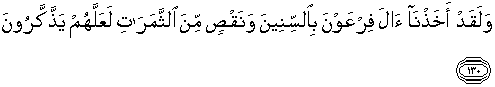 130. Dan sesungguhnya Kami telah menghukum (Fir'aun dan) kaumnya dengan (mendatangkan) musim kemarau yang panjang dan kekurangan buah-buahan, supaya mereka mengambil pelajaran.