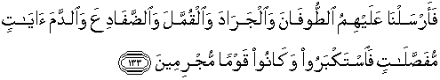 133. Maka Kami kirimkan kepada mereka taufan, belalang, kutu, katak dan darah