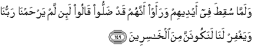 149. Dan setelah mereka sangat menyesali perbuatannya dan mengetahui bahwa mereka telah sesat, merekapun berkata: "Sungguh jika Tuhan kami tidak memberi rahmat kepada kami dan tidak mengampuni kami, pastilah kami menjadi orang-orang yang merugi."