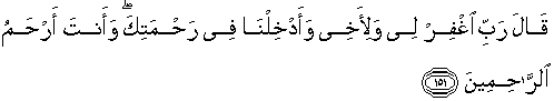 151. Musa berdoa: "Ya Tuhanku, ampunilah aku dan saudaraku dan masukkanlah kami ke dalam rahmat Engkau, dan Engkau adalah Maha Penyayang di antara para penyayang."