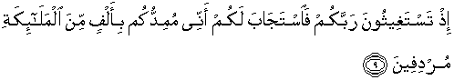 9. (Ingatlah), ketika kamu memohon pertolongan kepada Tuhanmu, lalu diperkenankan-Nya bagimu: "Sesungguhnya Aku akan mendatangkan bala bantuan kepada kamu dengan seribu malaikat yang datang berturut-turut."