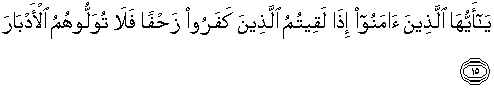 15. Hai orang-orang yang beriman, apabila kamu bertemu dengan orang-orang yang kafir yang sedang menyerangmu, maka janganlah kamu membelakangi mereka (mundur).