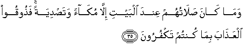 35. Sembahyang mereka di sekitar Baitullah itu, lain tidak hanyalah siulan dan tepukan tangan. Maka rasakanlah azab disebabkan kekafiranmu itu.