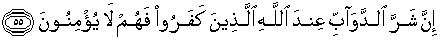 55. Sesungguhnya binatang (makhluk) yang paling buruk di sisi Allah ialah orang-orang yang kafir, karena mereka itu tidak beriman.