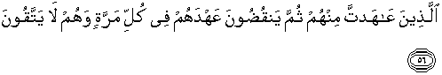 56. (Yaitu) orang-orang yang kamu telah mengambil perjanjian dari mereka, sesudah itu mereka mengkhianati janjinya pada setiap kalinya, dan mereka tidak takut (akibat-akibatnya).