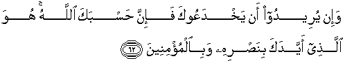 62. Dan jika mereka bermaksud menipumu, maka sesungguhnya cukuplah Allah (menjadi pelindungmu). Dialah yang memperkuatmu dengan pertolongan-Nya dan dengan para mukmin,