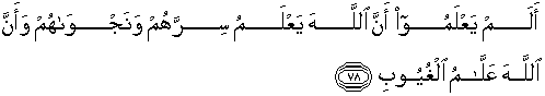 78. Tidaklah mereka tahu bahwasanya Allah mengetahui rahasia dan bisikan mereka, dan bahwasanya Allah amat mengetahui segala yang ghaib.