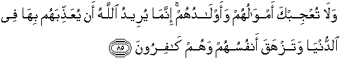 85. Dan janganlah harta benda dan anak-anak mereka menarik hatimu. Sesungguhnya Allah menghendaki akan mengazab mereka di dunia dengan harta dan anak-anak itu dan agar melayang nyawa mereka, dalam keadaan kafir.